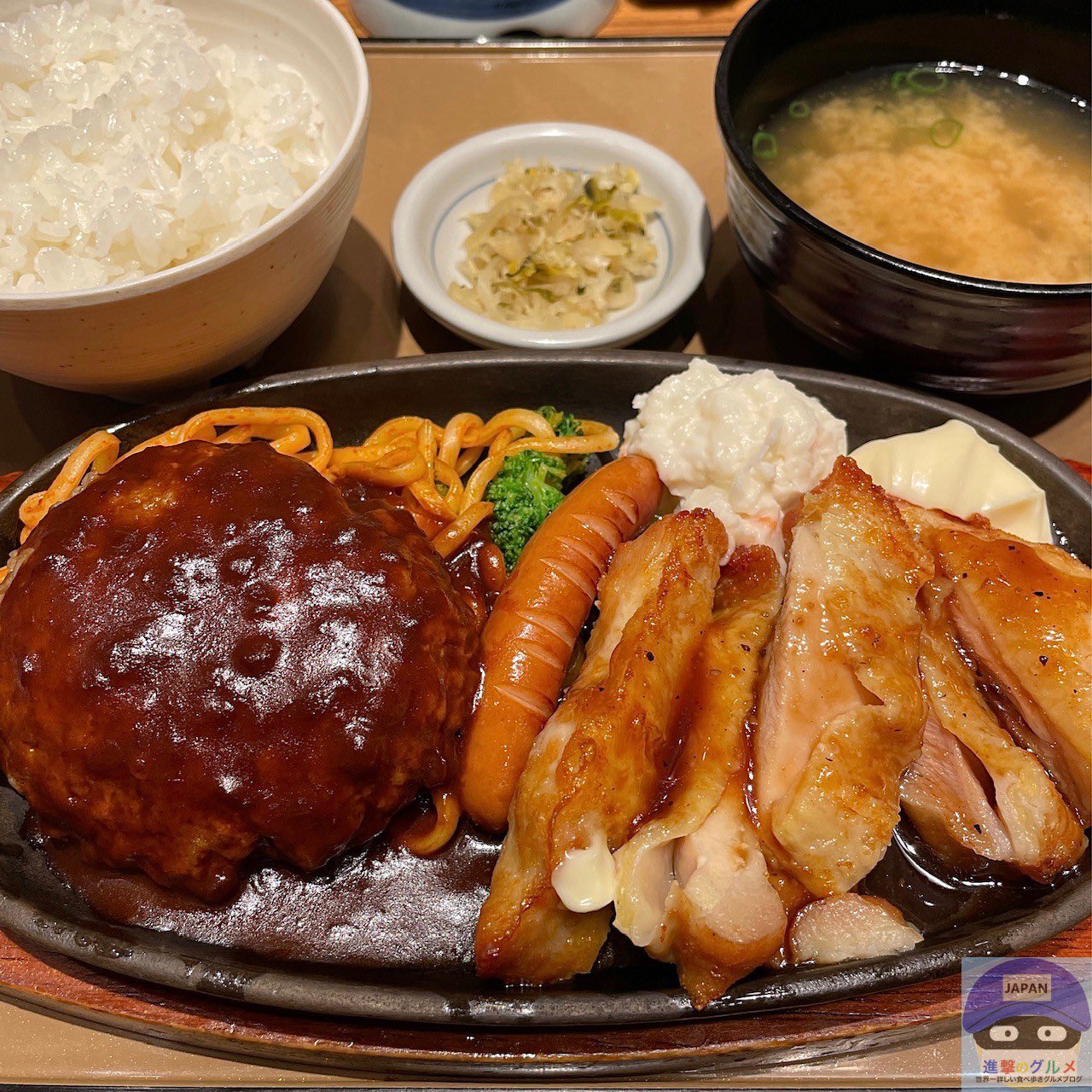 デミハンバーグとチキンステーキ、ウインナーを盛りつけた、食べごたえ抜群の肉料理尽くし定食です。